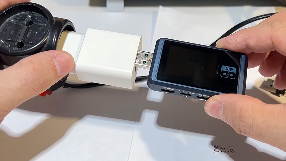 USB-A 타입을 꽂는 사진이지만, 측면에 USB-C 입력, 출력포트를 통해서 최근 나온 USB-C 충전기나 케이블 기기들 모두 다 테스트가 가능합니다.