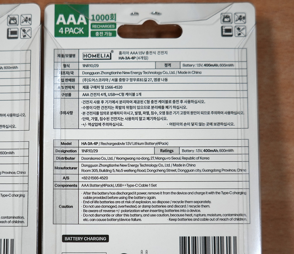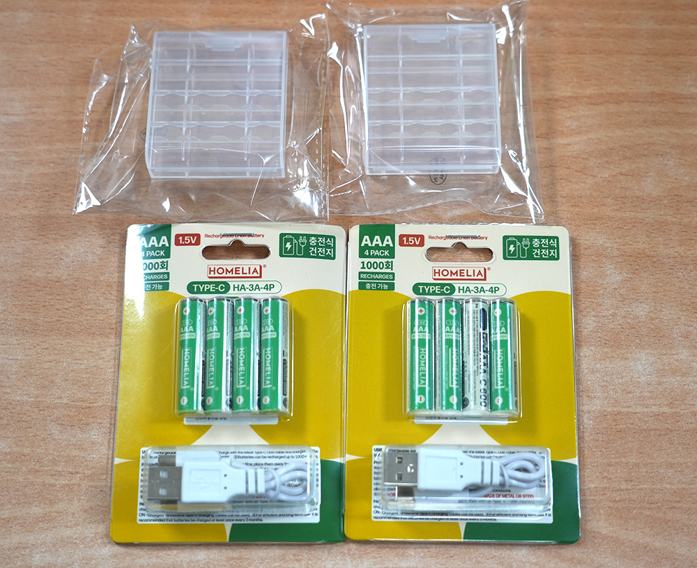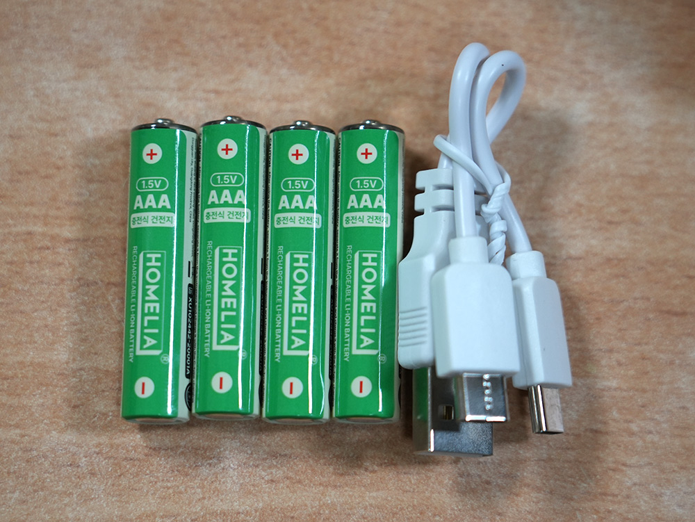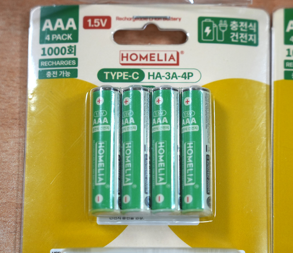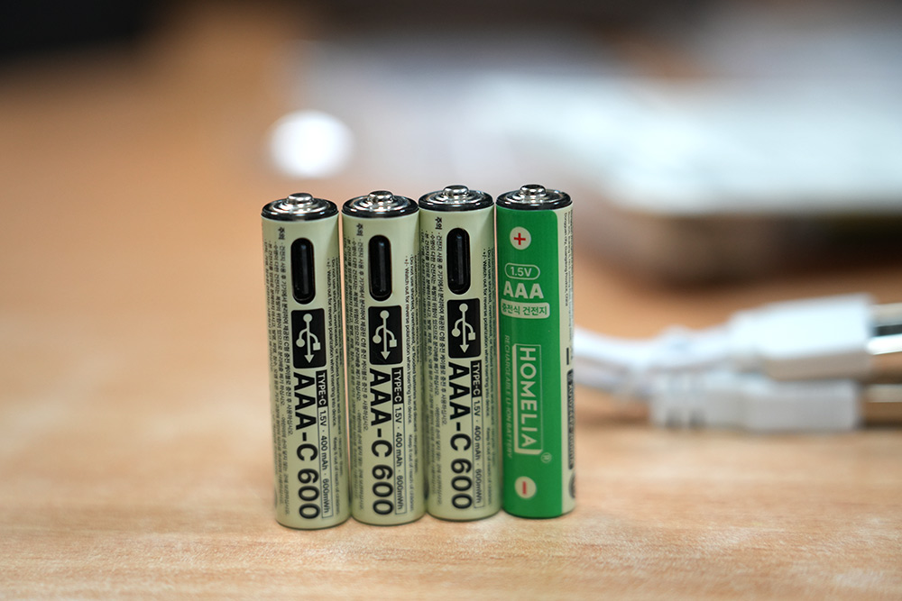 아이 장난감 때문에 건전지가 생각보다 많이 필요한데요. 홈리아 충전지 1.5V 충전용 건전지 AAA형 4알을 구매를 해 봤습니다. 일반 충전지는 1.2V 충전지 인데요. 그래서 처음에는 1.6V 이상까지 높은 전압을 내지만 사용하면서 전압이 낮아져서 실제 사용시간은 좀 짧아집니다. 홈리아 충전지 1.5V 충전용 건전지는 리튬이온 배터리를 1.5V로 전압을 출력하는 형태로 배터리 잔량을 다 쓸 때까지 일정하게 1.5V 전압이 나오기 때문에 실제 기기의 사용시간이 많이 길어집니다. 게다가 1000회 이상 충전해서 재사용이 가능해서 일반 1.2V 충전지보다는 훨씬 괜찮은데요. 근데 USB-C 타입으로 편하게 충전하면서 쓸 수 있는 홈리아 충전지 1.5V가 비교적 저렴하게 판매하고 있어서 바로 사 봤습니다.