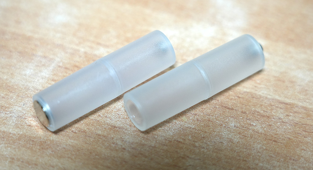 건전지 컨버터도 사용하고 있는데요. 한가지 참고할 점은 건전지 컨버터는 - 부분에 극판이 있는것을 구매하는게 좋습니다. 국내에서 여러 사이트에서 구매를 해 봤는데 상품 설명에는 - 극이 있는 것처럼 나오는데 실제로는 오른쪽 처럼 그냥 구멍이 뚫린 제품이 많았습니다. 그래서 실제로 국내에서 3번 주문했는데 다 이런 형태라 결국 환불을 했습니다.