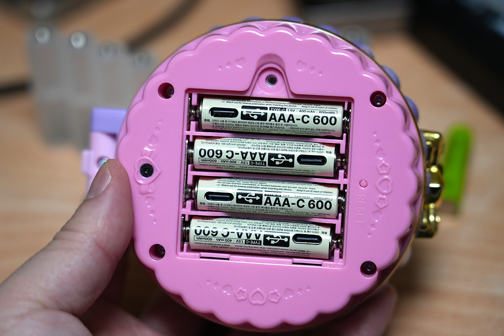 아이 장난감에 1.5V 충전지를 넣어 봤습니다. 참고로 USB-C 단자가 외부로 보이게 돌려두면 건전지를 굳이 빼지 않아도 USB-C 케이블 연결해서 충전 할 수 도 있습니다.