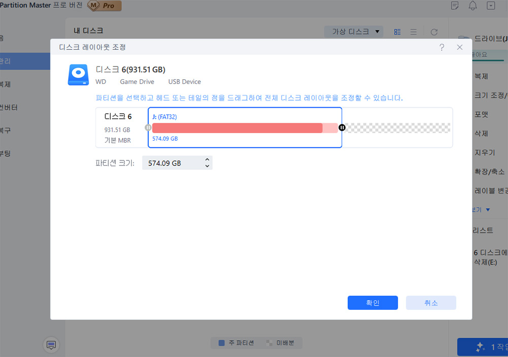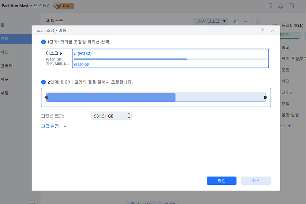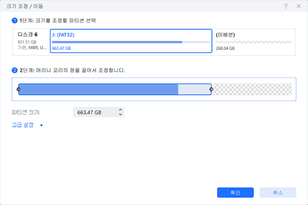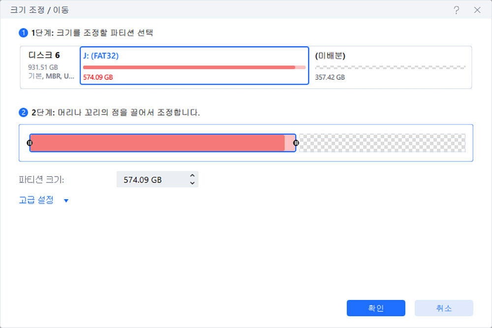 최대로 늘리면 2개 파티션으로 나눠져 있던 공간을 하나의 파티션으로 합칠 수 있습니다.