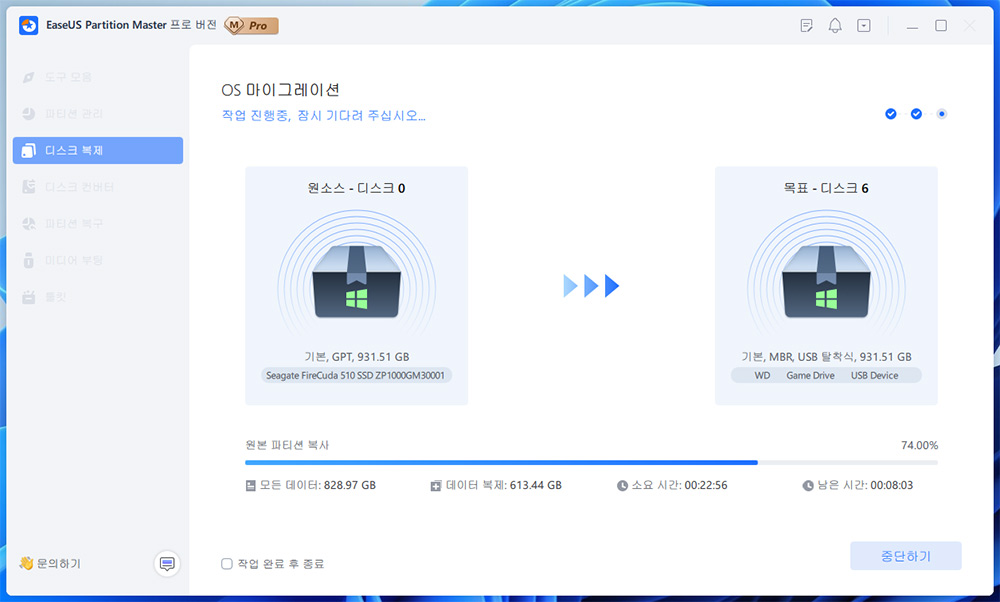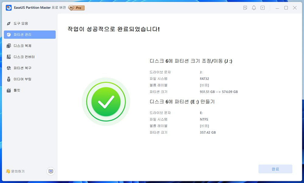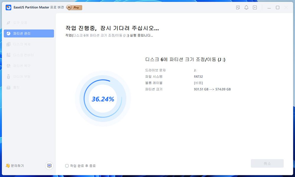 근데 기다리니 결국 작업이 완료가 되었습니다. 사실 그전에 작업 중에 프로그램을 강제로 닫은적이 있는데요. 그러면 파티션 작업이 되던게 다시 원래대로 복원이 되긴 하더군요.