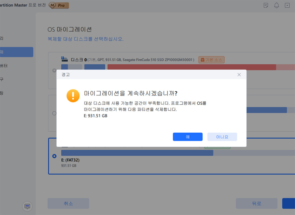 실제로 OS 마이그레이션도 해 봤는데요. 이 경우 타켓의 디스크의 내용들은 모두 지워집니다. 지워지기 전에 경고가 나오는데 정확히 잘 확인 후 예를 누릅니다.