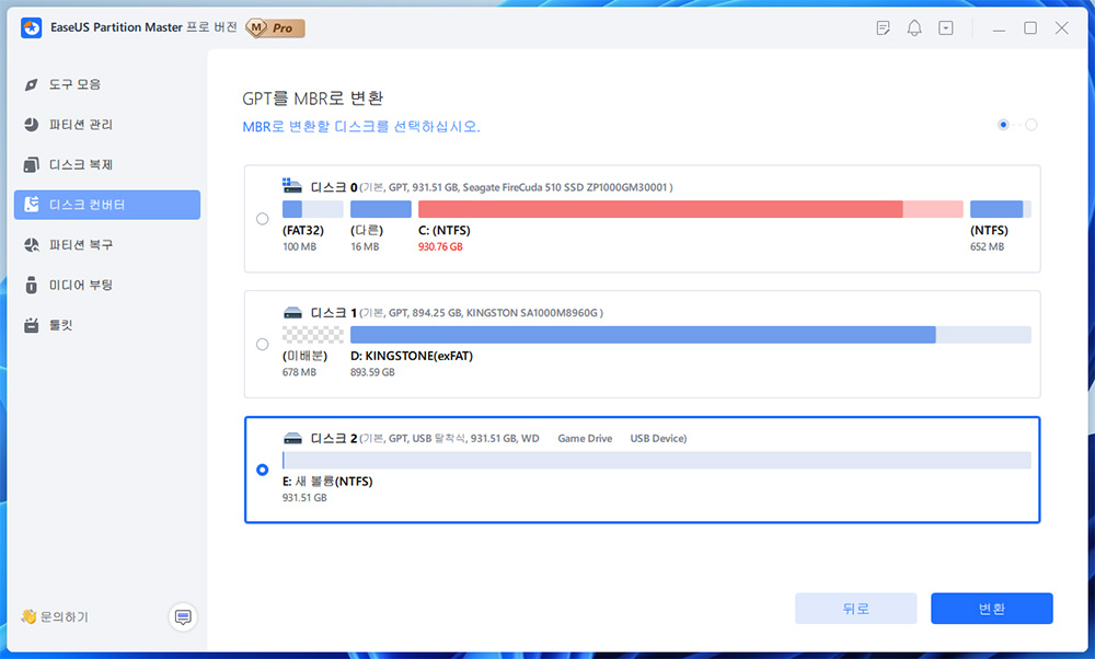 GPT > MBR로 변경을 변환 버튼 눌러서 바꿔봤습니다.