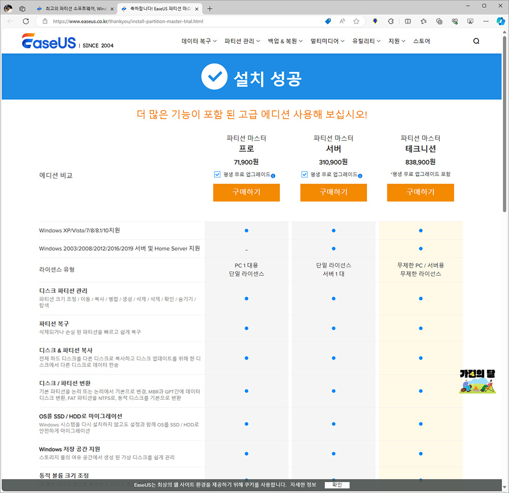 파티션 마스터는 프로, 서버, 테크니션 3가지 타입으로 구매해서 사용할 수 있는데요. 지원하는 기능이 좀 다르니 참고하세요. 보통은 개인유저가 사용하기에는 프로 버전으로 충분 합니다.