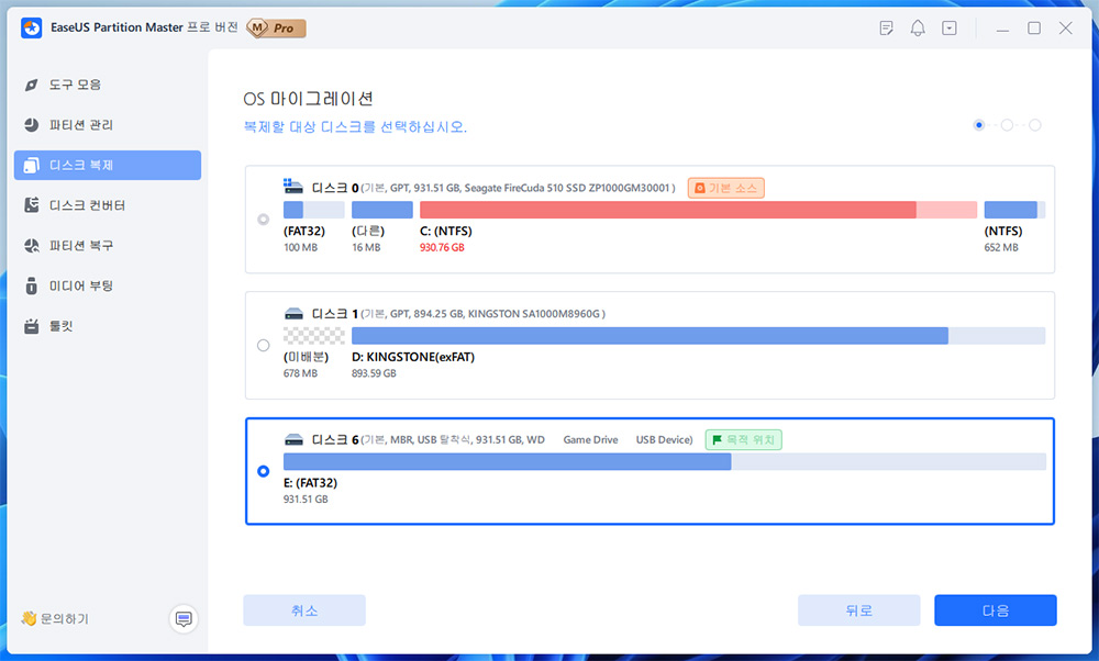 OS 마이그레이션을 선택해 봤는데요. 선택하면 복제 대상은 이미 선택이 되었고, 타켓만 지정하면 됩니다. 어디에 복제를 할지 선택 후 다음을 누르면 됩니다.