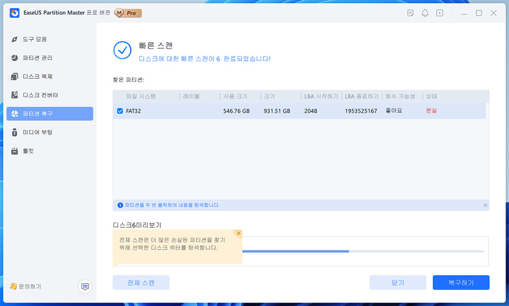스캔 작업이 끝나면 가장 디스크의 마지막 상태의 파티션이 나타납니다. 만약 더 이전 상태의 파티션 상태를 확인하고 싶은 경우 전체 스캔을 통해서 더 정밀하게 스캔하면 됩니다. 이전 상태로 저는 돌리는게 목적이라 바로 복구하기를 해 봤습니다.
