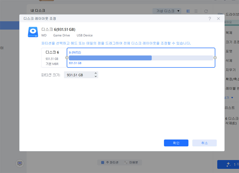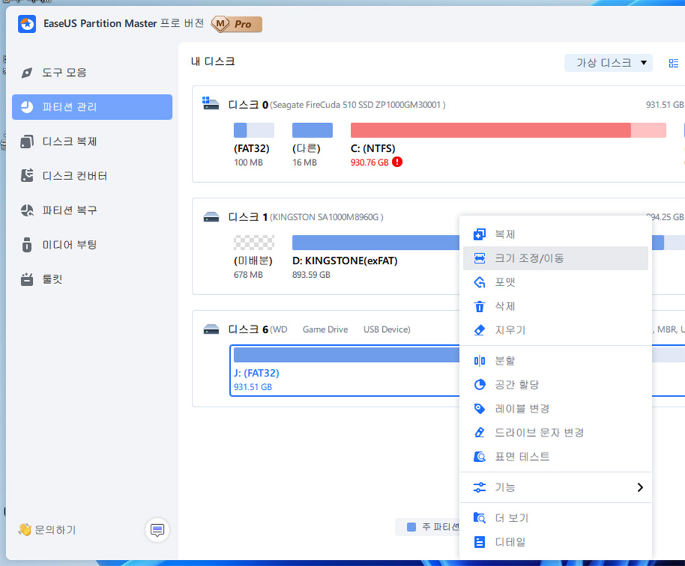 파티션 관리에서 파티션의 크기 및 이동을 할 수 있는데요.
