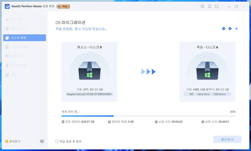 그런데 복제를 실제로 할 때 실제 작업 시간은 꽤 오래 걸렸습니다. 전문적인 복제 툴에 비해서는 복제 속도가 좀 느린 부분이 있긴 했습니다.