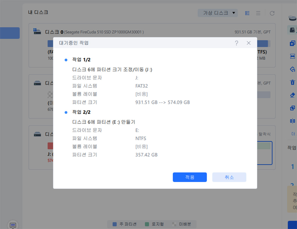 실제 작업 시 한번 더 물어보는 과정이 있습니다. 적용을 누르면 비로서 작업이 실제로 일어납니다.