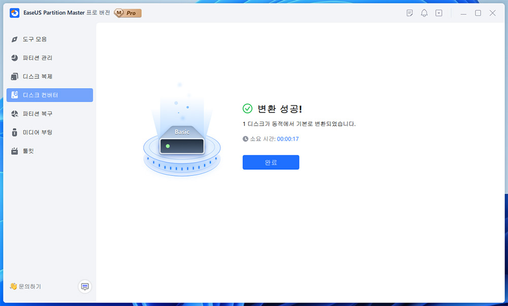 17초 만에 변경이 되었습니다. 간단하게 동적디스크가 기본디스크가 되었습니다.