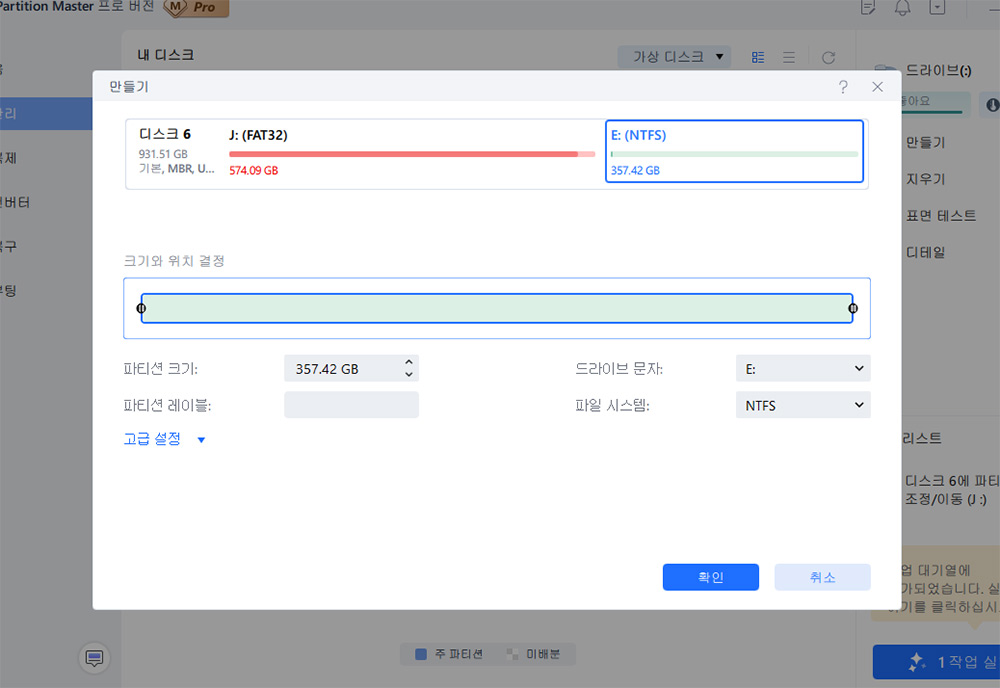 확인 부턴을 만들면 여유공간이 E드라이브로 생성이 됩니다.