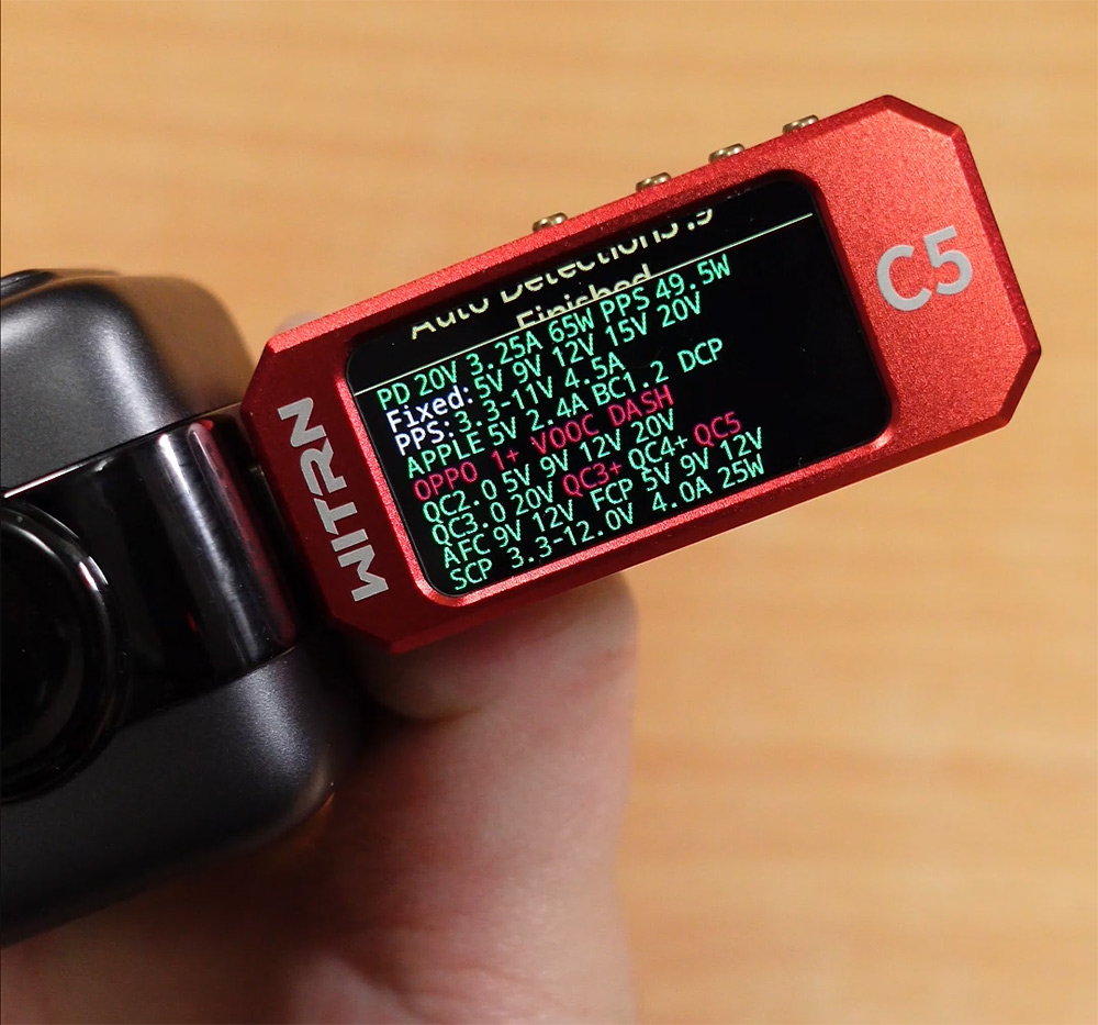 테스터기에 연결해서 첫번째 포트의 속성을 확인해 봤는데요. PD 20V 3.25A로 65W를 지원하는게 확인 됩니다. PPS는 49.5W까지 가능한것으로 나옵니다. 작지만 괜찮은 성능으로 휴대하면서 노트북이나 스마트폰 충전하기 괜찮은 제품 같습니다. 좀 아기자기한 제품들 모으는 분들은 구매해보셔도 좋을 것 같습니다.