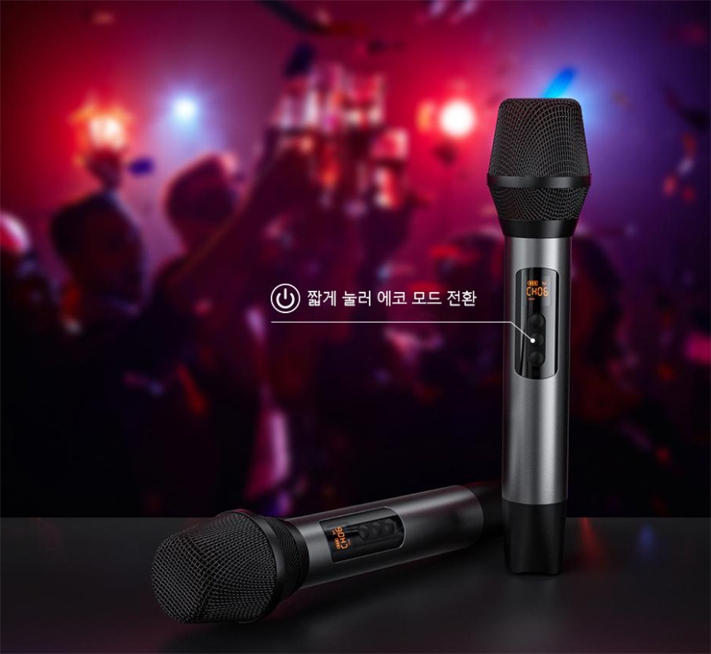듀얼 무선 마이크로 활용할 수 있는데요. 요즘은 노래방 가본지도 오래된 것 같긴 하네요. 하지만 이런 제품 있으면 어디서든지 노래방처럼 활용할 수 있습니다.