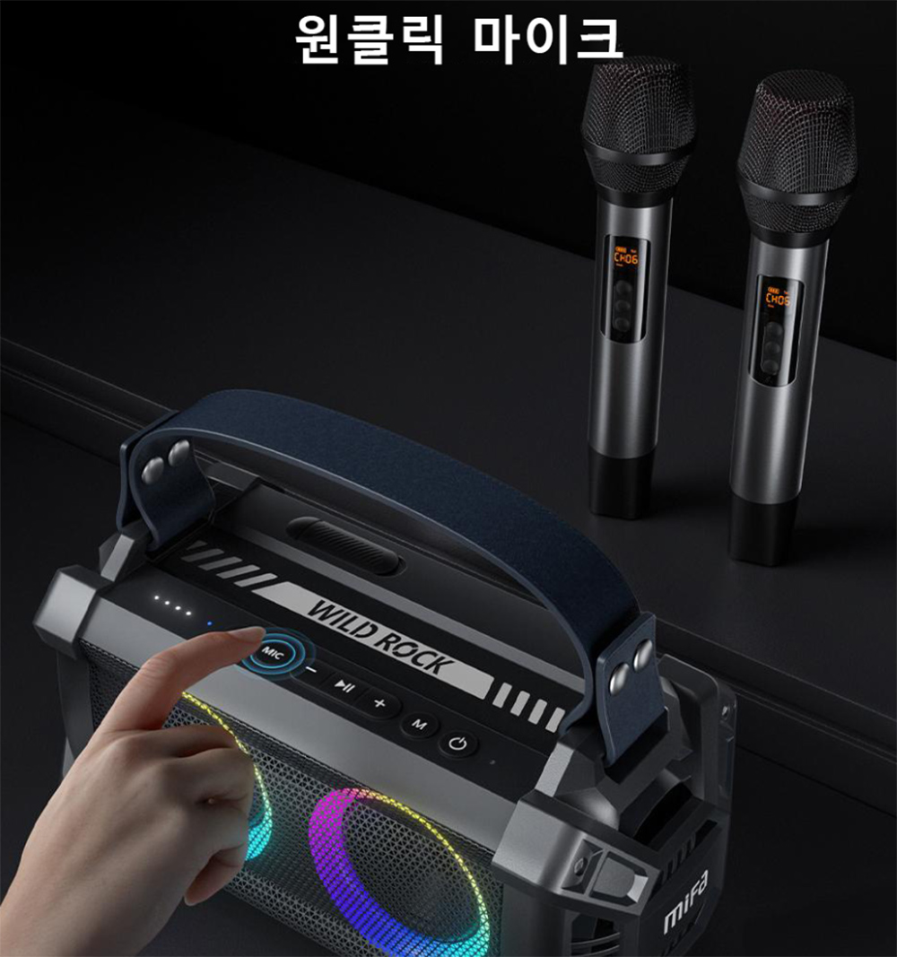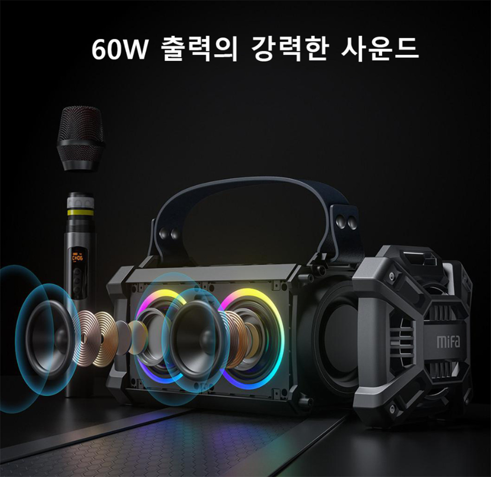 야외에서는 노래방 마이크가 있으면 괜찮겠더군요. 그래서 알아본 제품인데요. mifa WildRock 휴대용 노래방 파티 스피커 입니다. mifa 제품은 일반 블루투스 스피커 제품도 가지고 있긴 한데요. 음질도 훌륭하고 휴대성도 좋아서 야외에서 쓰기 좋은데요. 그런데 마이크가 연결된 이 제품은 노래방 마이크처럼 사용할 수 있습니다. 60W 출력이 가능해서 야외에서도 충분히 사용할 수 있는데요. 마이크도 2개 연결이 가능해서 동시에 두명이 노래를 부를 수 있습니다.