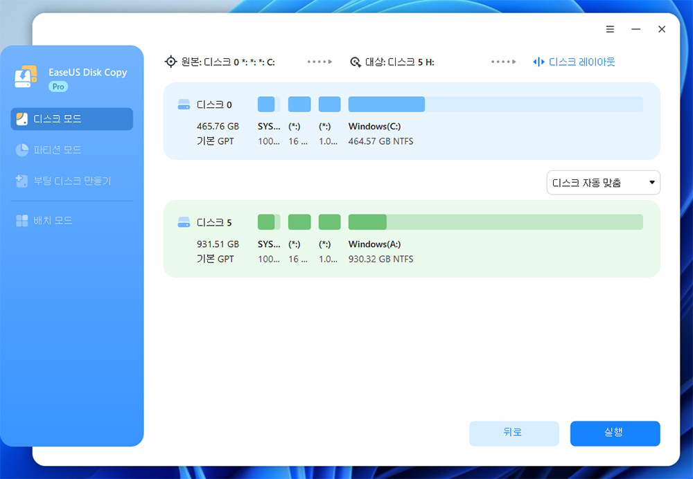 참고로 디스크 자동 맞춤을 하면 작은 용량의 저장소에서 큰 용량의 저장소로 옮길 때 파티션 크기는 비율에맞춰서 크기가 커집니다. 물론 시스템 파티션 등은 크기가 그대로 유지가 되네요.