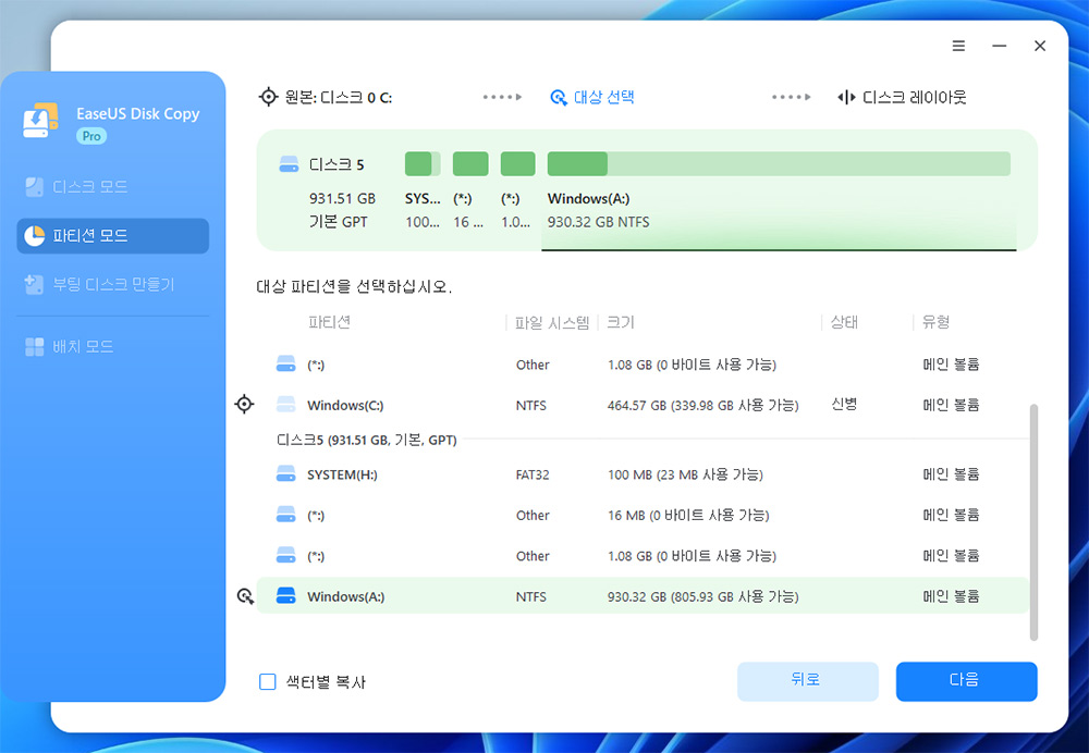 파티션 모드에서는 원하는 파티션을 지정해서 복제가 가능한데요.