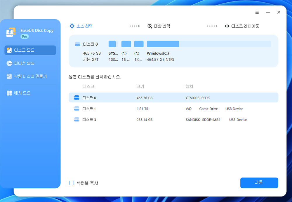 디스크 단위로 데이터를 그대로 통째로 옮기기 위해서 디스크모드를 선택합니다. 원본 소스를 먼저 선택하는데 디스크0을선택을 합니다. 물론 디스크 순번은 달라질 수 있으므로 운영체제가 포함된 디스크를 선택 합니다. 다음을 누릅니다.