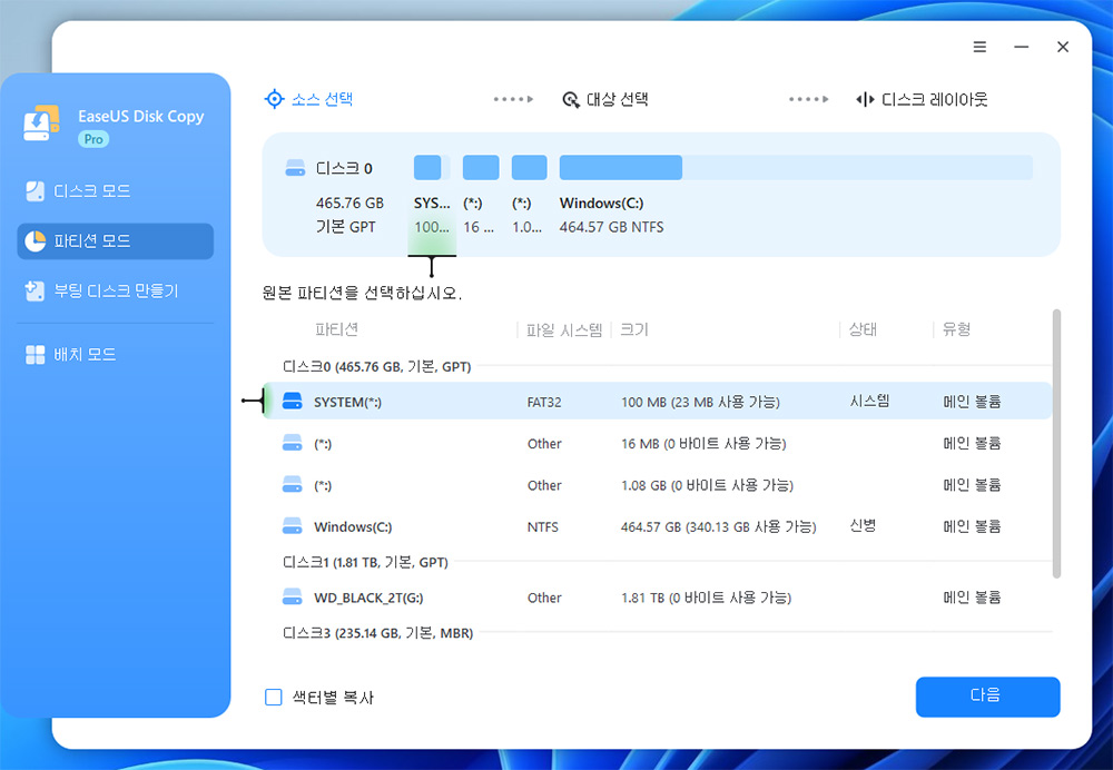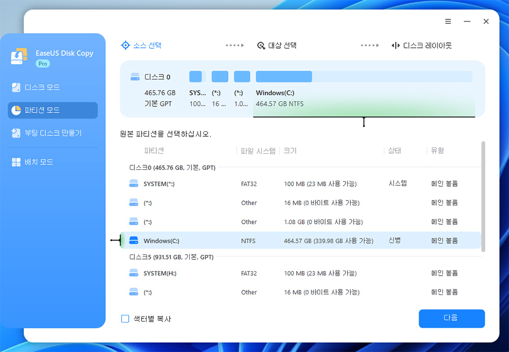 만약 C/D 드라이브 등으로 파티션이 나눠져 있는데 C 드라이브만 복제를 하고 싶을 때는 파티션 모드로 복제를 하면 됩니다.