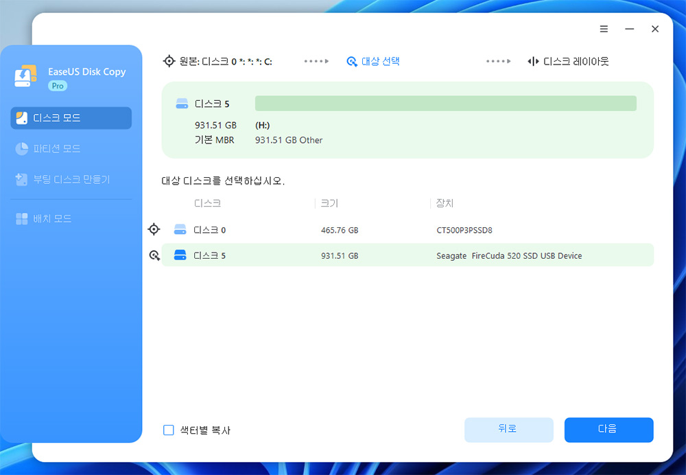 참고로 섹터별 복사를 선택하면 오류가 있는 부분 (배드섹터) 도 그대로 복제를 합니다.