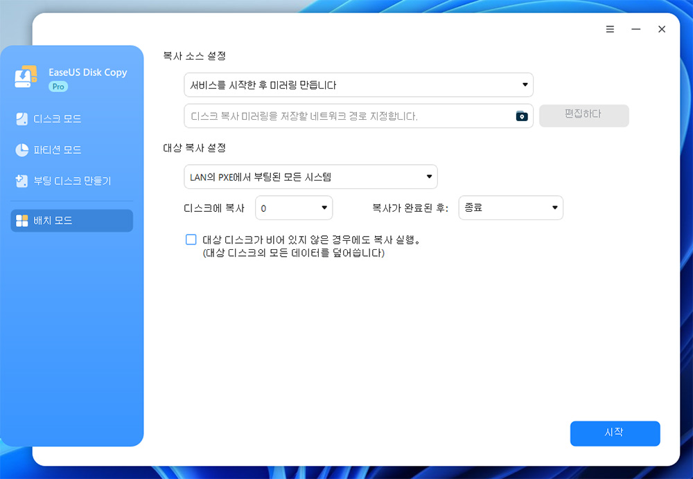 추가로 배치모드도 지원 합니다. 복사 소스 설정을 하고 대상 복사 설정을 하면 네트워크에 연결된 다른 디스크에 내용을 복사하는게 가능합니다. 아무래도 이건 많은 컴퓨터를 동시에 관리를 할 때 활용이 많이 될 것 같습니다.