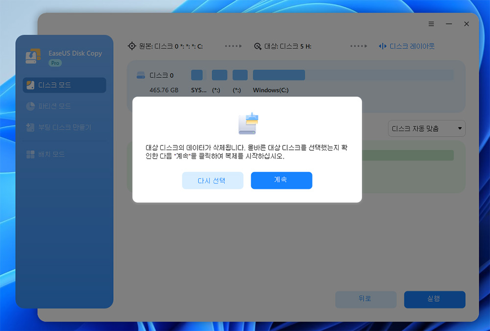 실행을 누르면 복제가 시작되게 되는데요. 경고가 한번 뜹니다. 복제 대상의 기존 데이터는 모두 지워지고 원본의 데이터가 복제 되기 때문에 삭제에 대한 경고 입니다. 계속을 누릅니다.