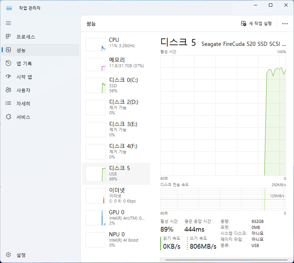 실제로 데이터 옮겨지는 속도를 보면 800MB/s를 넘어가네요.