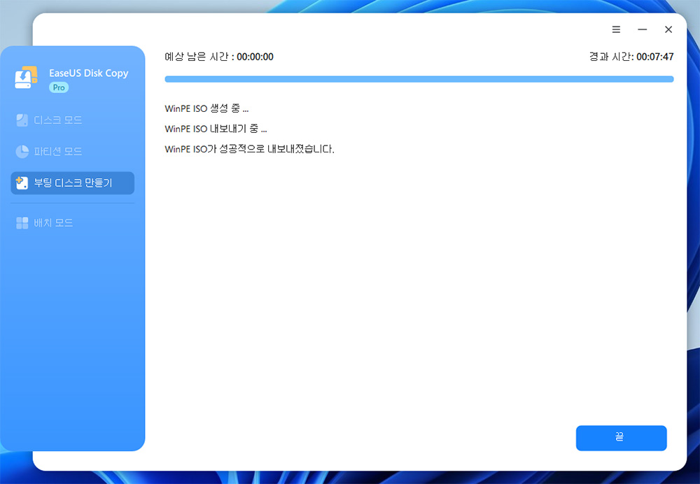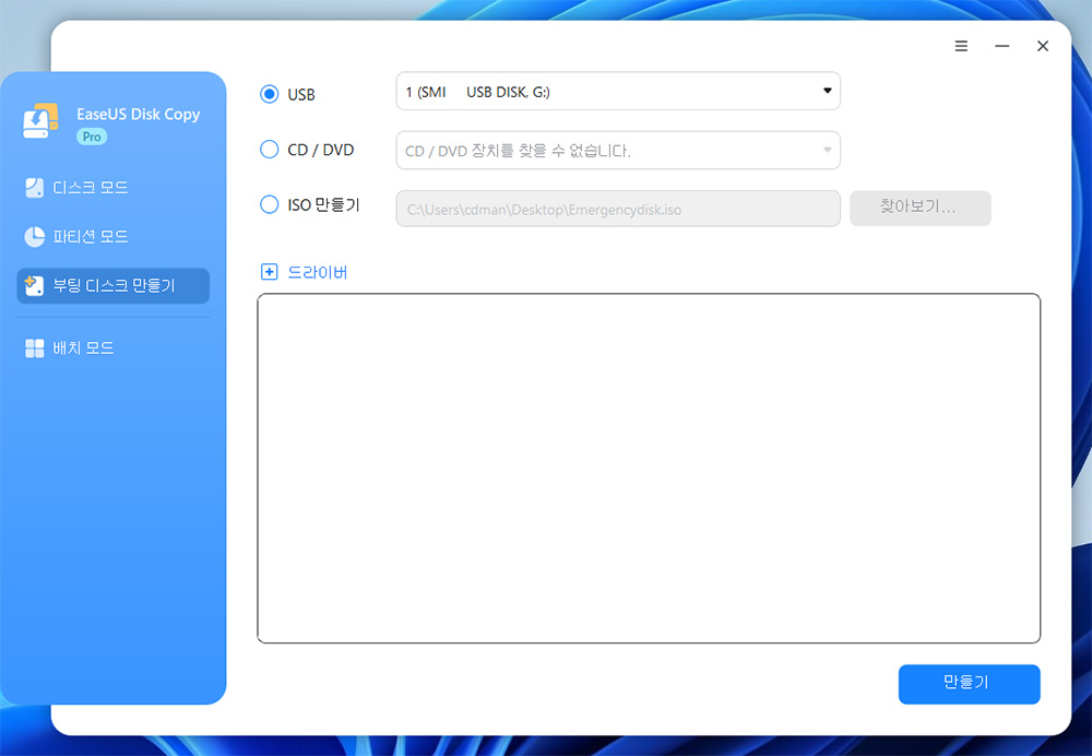 추가로 부팅 디스크 만들기도 지원 합니다. 특별한 목적으로 컴퓨터에서 USB 디스크 등으로 부팅해서 복구 모드를 이용하거나 할 때 활용할 수 있습니다.