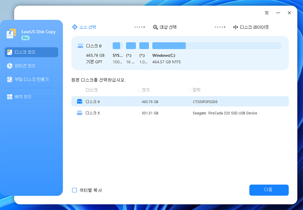 디스크 단위로 데이터를 그대로 통째로 옮기기 위해서 디스크모드를 선택합니다. 원본 소스를 먼저 선택하는데 디스크0을선택을 합니다. 물론 디스크 순번은 달라질 수 있으므로 운영체제가 포함된 디스크를 선택 합니다. 다음을 누릅니다.