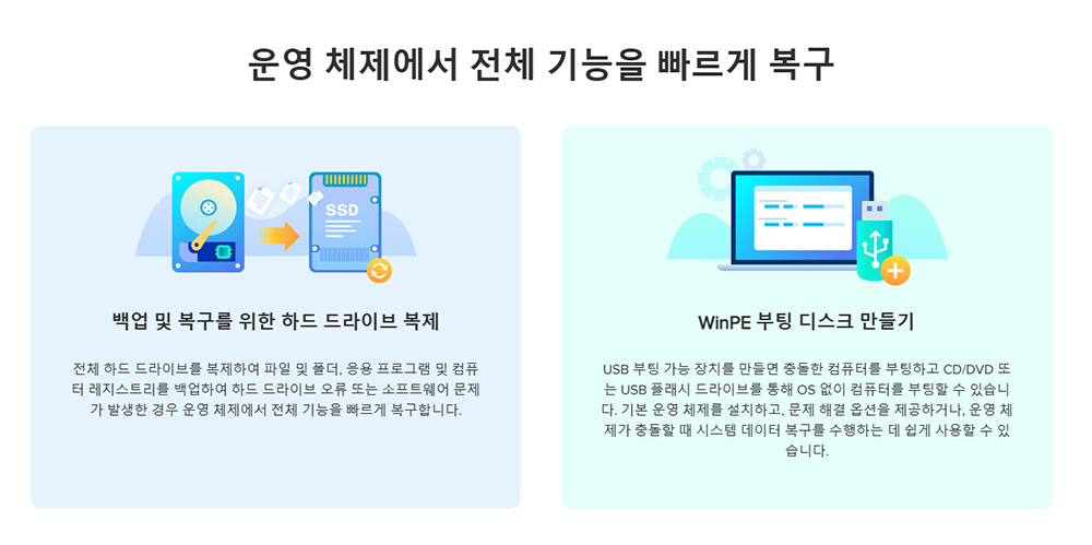 추가로 이 프로그램은 백업 및 복구를 위한 드라이브 복제를 할 수 있는데 하드 드라이브의 오류 또는 소프트웨어 문제가 있는 경우를 예방하기 위해 활용합니다.