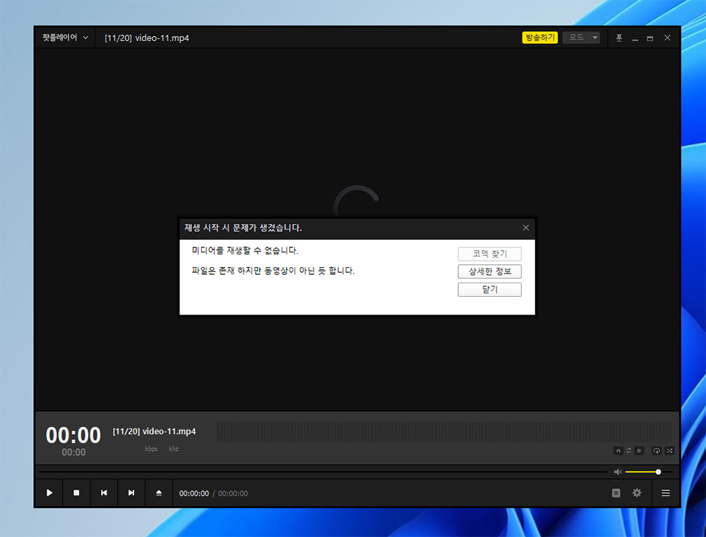 이런 경우 영상이 용량도 있고, 재생이 될 듯 싶지만, 실행해보면 결국 동영상이 아닌것 같다면서 재생이 안됩니다. 팟플레이어는 영상이 다 다운로드가 안된 상태의 온전한 파일이 아니여도 보통은 재생이 되는데요. 이 프로그램으로도 재생이 안되면 대부분 포기하시는데요.