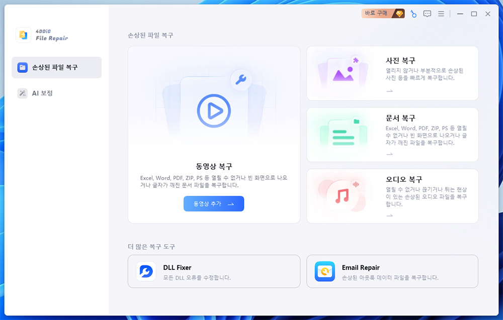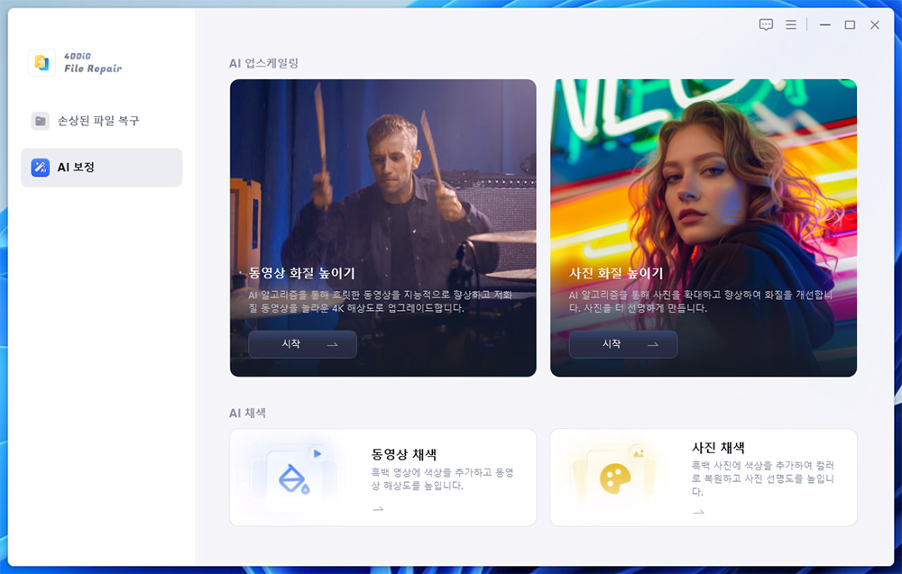 프로그램 메인화면 입니다. 손상된파일 복구, AI 보정을 할 수 있습니다. 먼저 동영상 복구를 해보도록 하겠습니다.