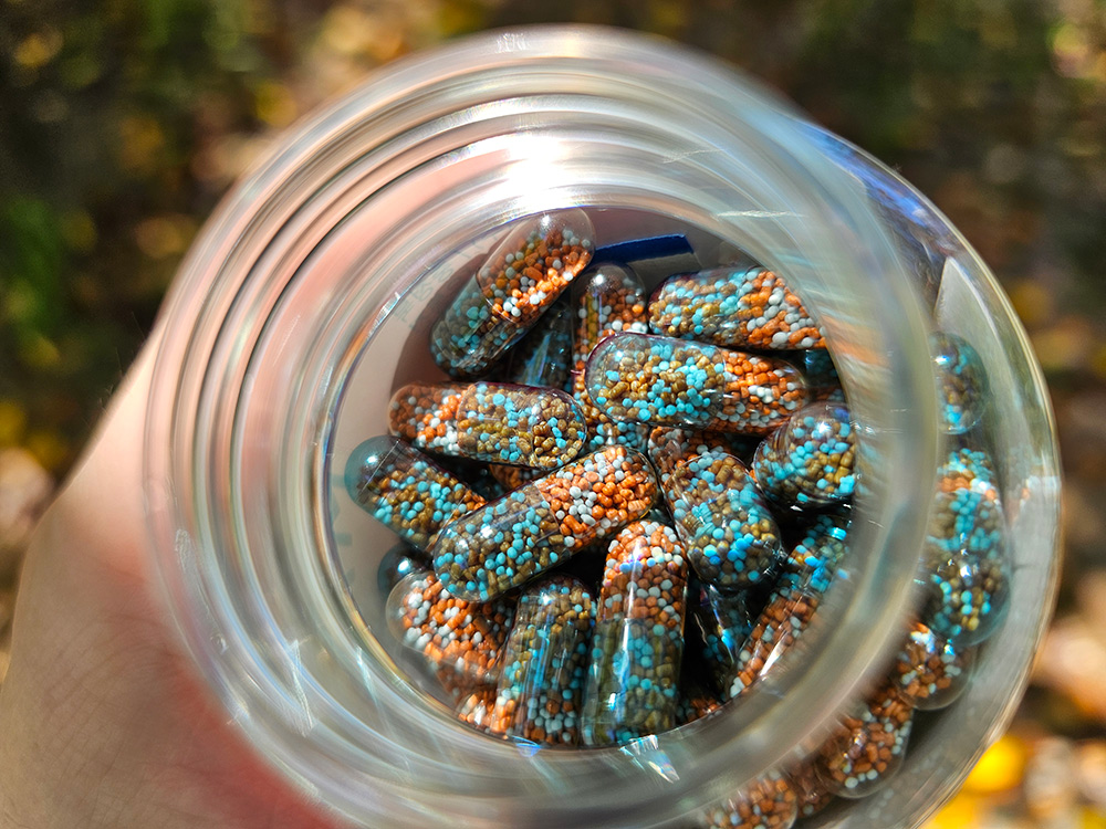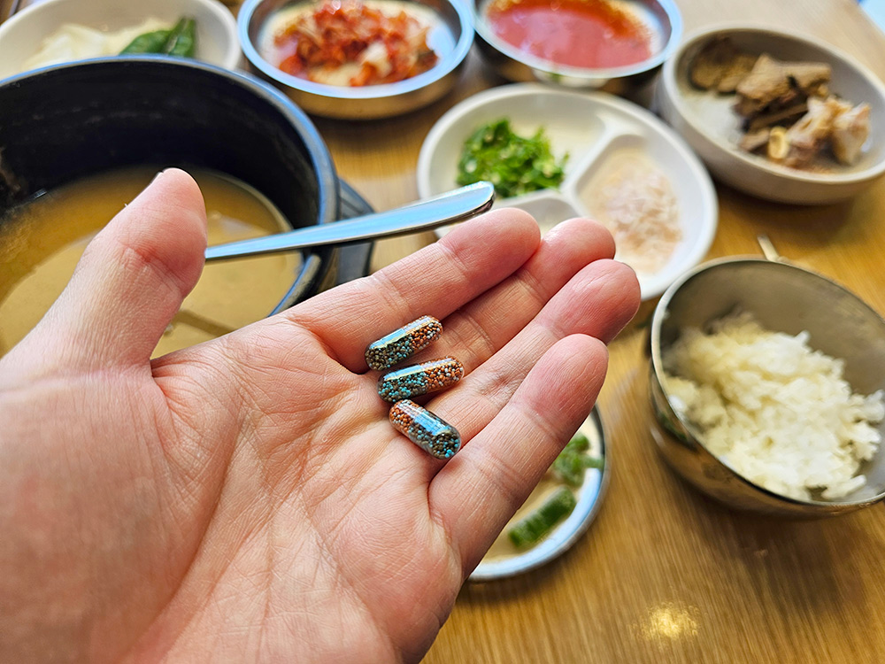 알약이 좀 이쁘게 생겼다고 했는데요. 투명한 알약 재질로되어있는데 내부에 작은 알갱이가 여러가지 색상으로 들어가 있고 이게 보이니까 얼른 먹고 싶은 생각이 들더라구요.