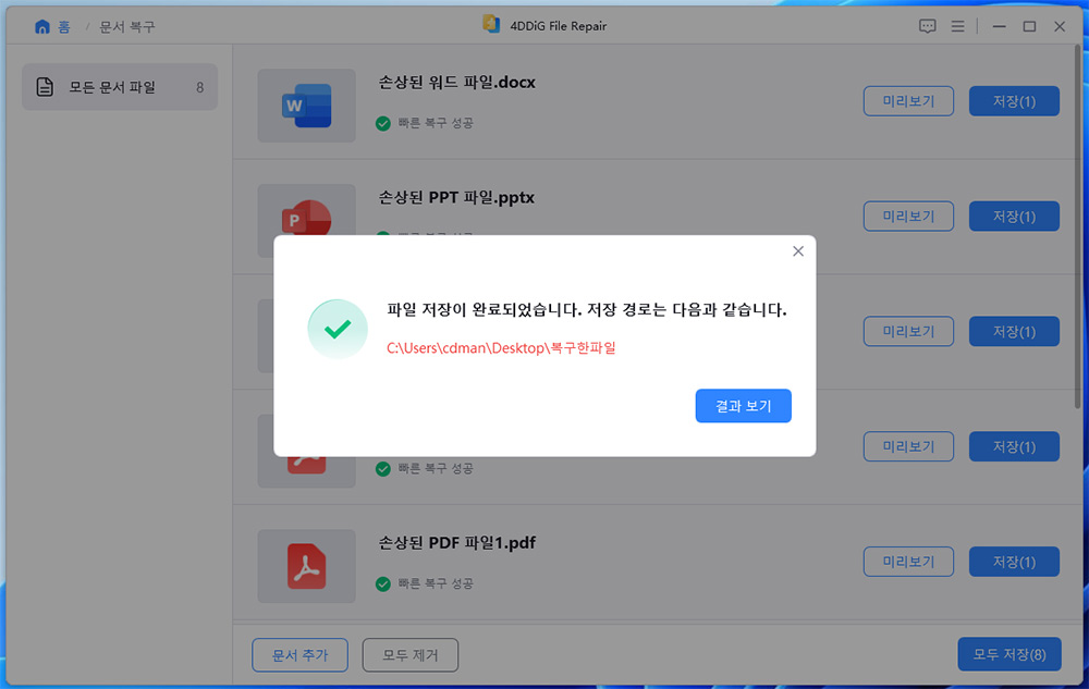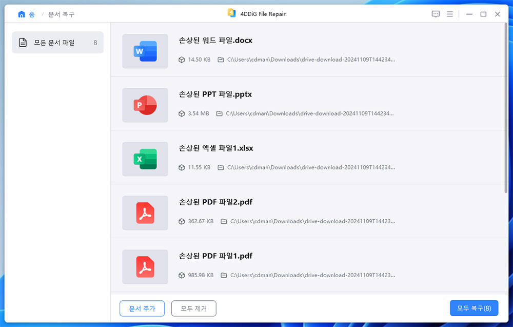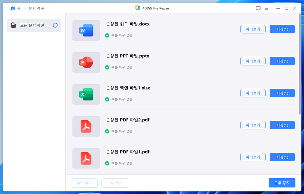 문제의 문서파일을 추가 합니다. 여러개의 파일을 동시에 복구할 수 있습니다. 아래 모두 복구 버튼을 누릅니다.