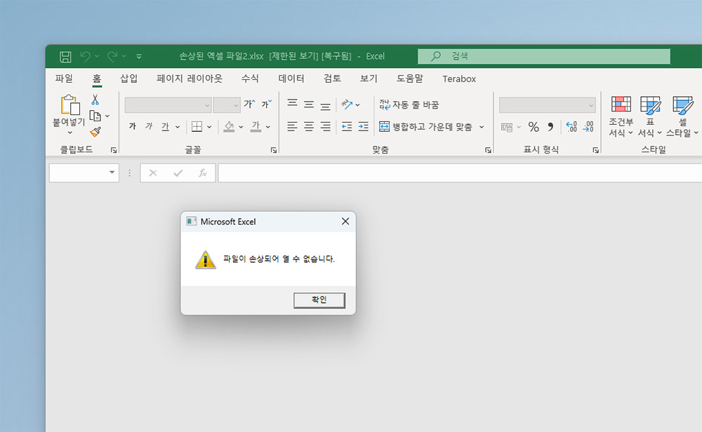 문제의 엑셀파일을 열어봅니다. 파일이 손상되어 열 수 없습니다. 라고 나오고 열리지 않습니다.