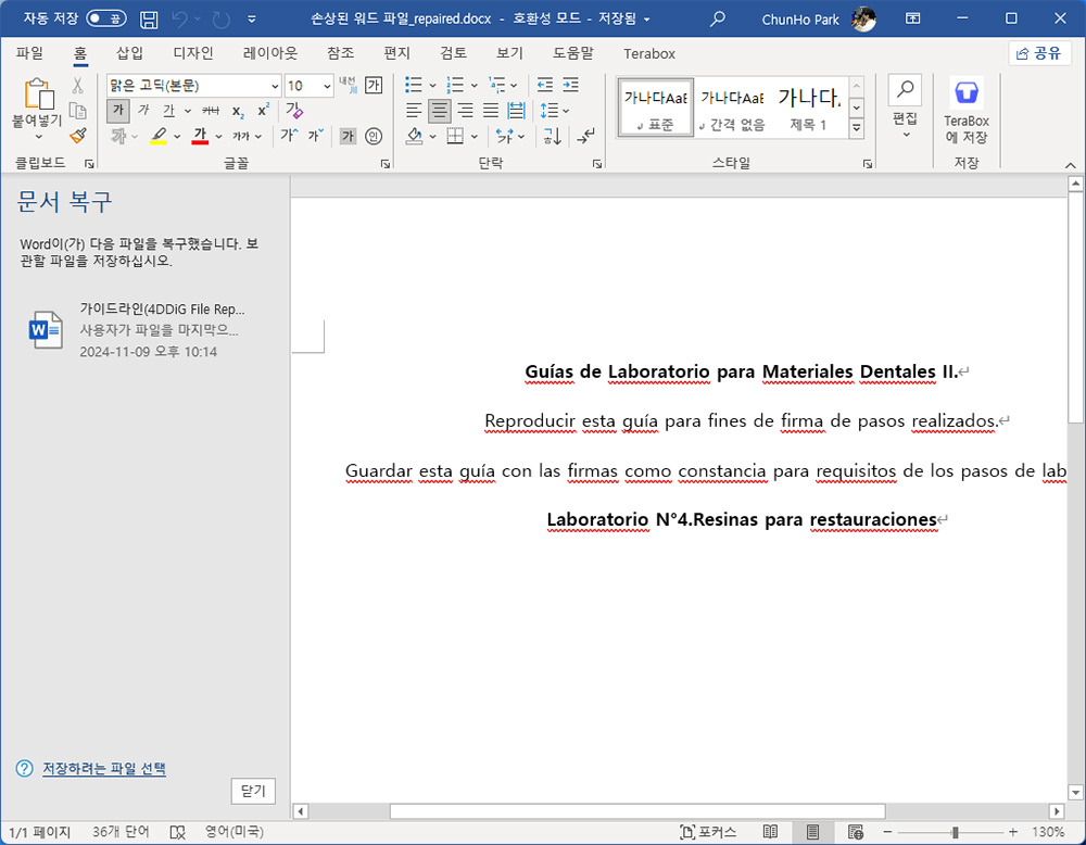 실제로 문서파일을 열어봐도 잘 열립니다. 문서 복구가 이렇게 간단하게 끝납니다.