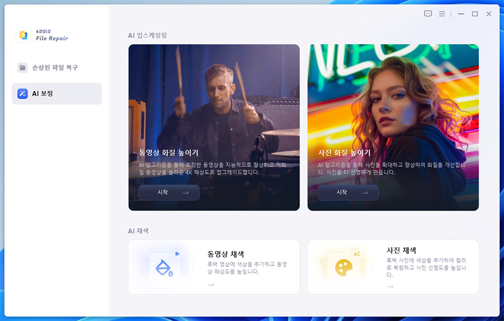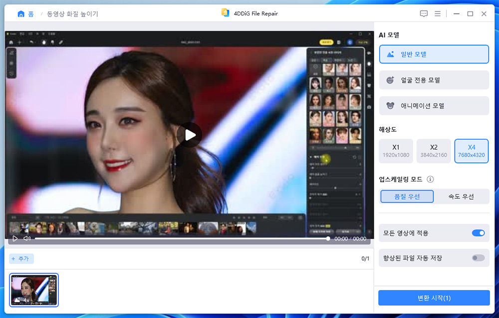 Ai 보정 기능도 있습니다. 영상이 옛날 영상인 경우 화질이 떨어지거나 해상도가 낮은 경우 더 고화질의 영상을 만들 수 있습니다.