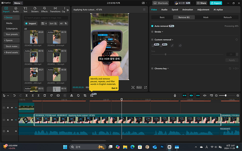 간단히 NPU를 활용할만한 부분이 있는데 영상 편집에서 해볼 수 있습니다. 과거에는 배경과 피사체를 분리할 때 수작업으로 많은 시간이 걸렸지만 요즘은 이런 반복적이고 귀찮은 작업을 AI가 대신 처리해줍니다.