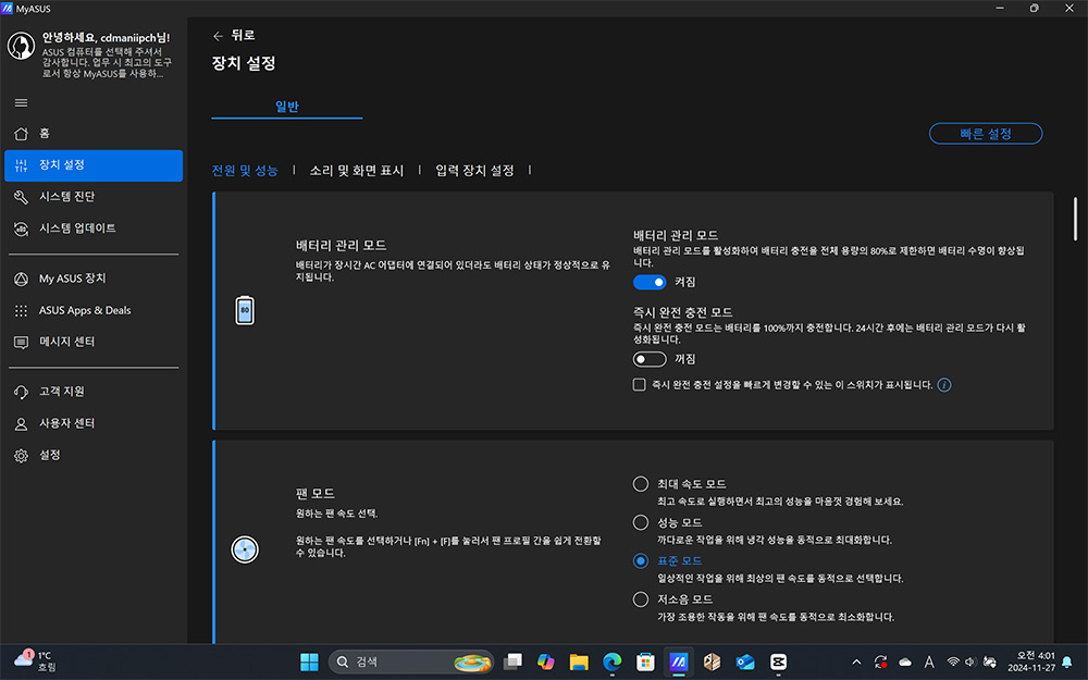 장시간 노트북을 전원 연결시켜놓고 사용하는 경우 배터리가 노화되는 현상이 가속화되는데 그것을 줄이기 위해서 배터리 관리모드도 지원 합니다. 그 외에 더 빠르게 충전해서 즉시 완충 충전 모드도 활용할 수 있습니다. 그 외에 팬 모드를 통해서 팬 속도를 더 조용하게 또는 최고 속도로 동작시켜 더 높은 성능을 낼 수 도 있습니다.