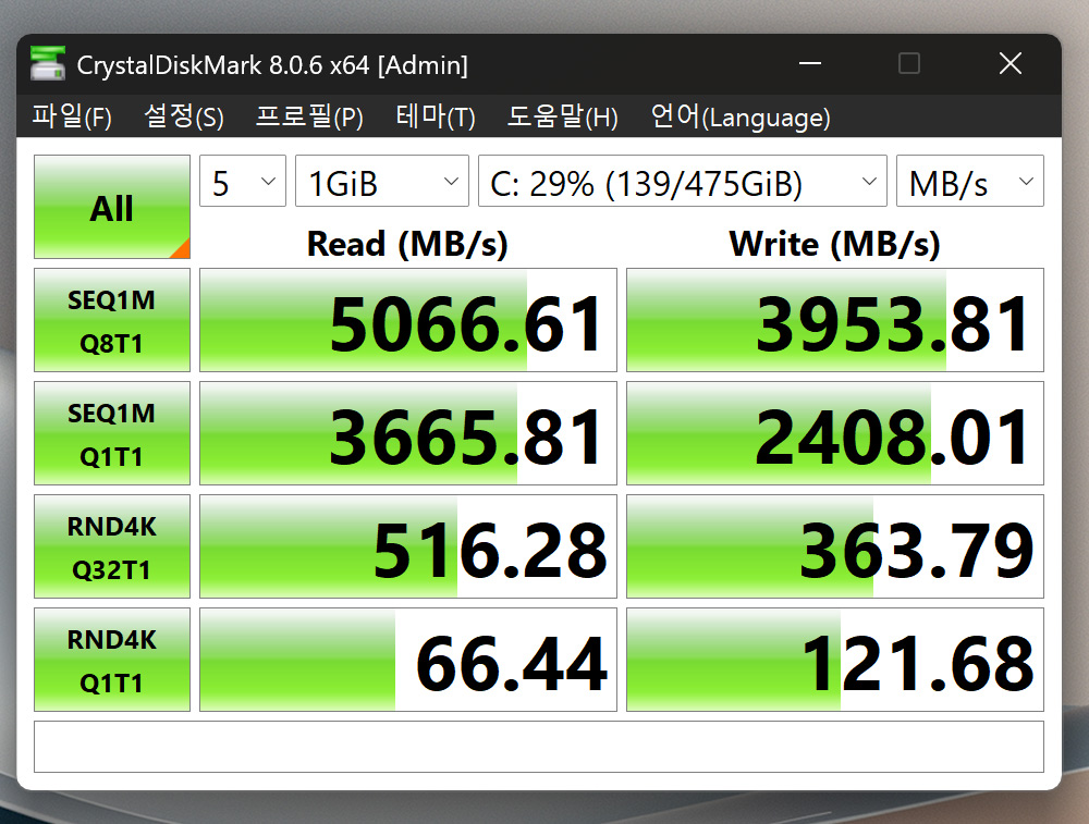 SSD 저장장치는 PCIe4.0 NVMe 타입으로 준수한 성능을 보여줍니다.