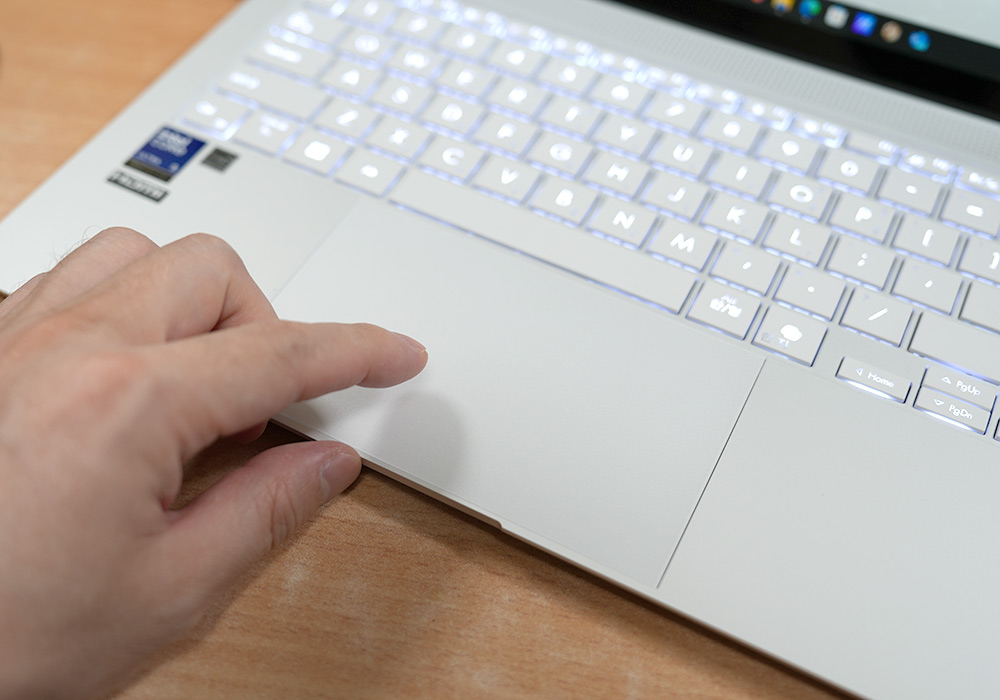 터치패드는 127.0 x 79.17mm 사이즈로 노트북 본체 사이즈에 비해서 상당히 큰데요. 수소성 코팅과 고급 PVD 지문 방지 코팅이 되어있어서 매끄럽고 부드럽게 동작합니다. 내구성이 좋아서 1만회 이상 슬라이드를 해도 새것처럼 매끄럽다고 하는데요. 제가 더 마음에 들었던 부분은 윈도우에서 커서도 매끄럽게 잘 동작하는 부분이었습니다. 반응성이 더 좋아진 것 같네요.