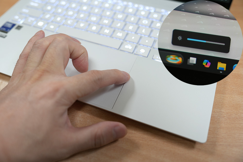 노트북 화면 밝기 조정의 경우 터치패드의 오른쪽 끝 부분을 위아래로 슬라이드를 하면 조정이 가능합니다.