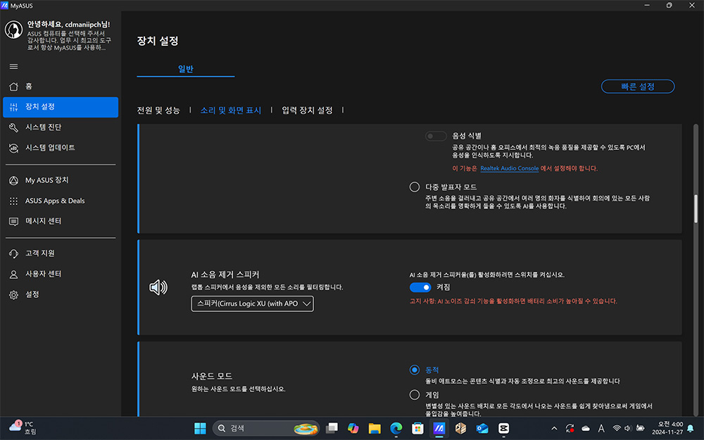 AI 소음 제거 스피커를 활용해서 노이즈를 줄이는 설정도 가능합니다.