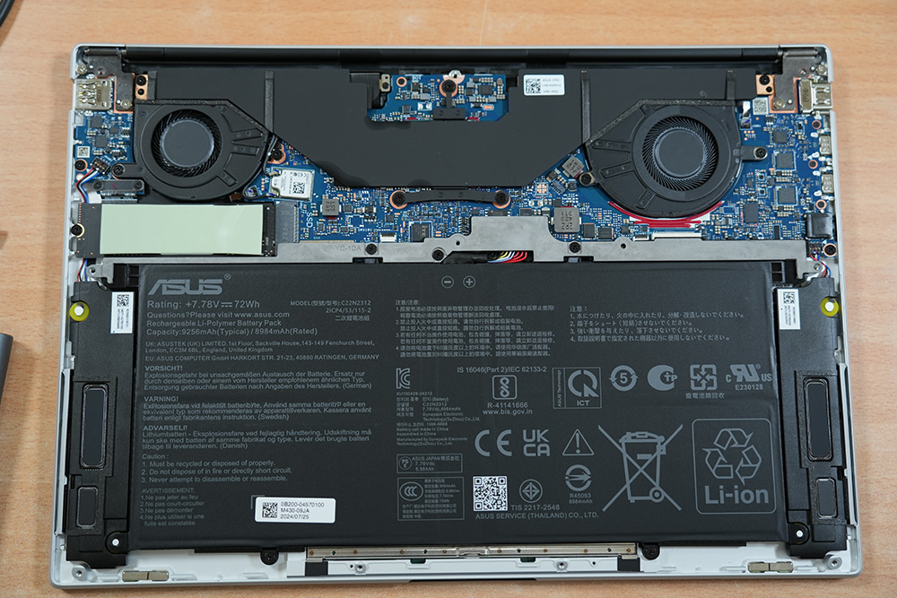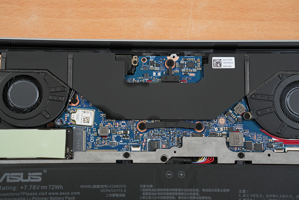 분해해보면 내부에 팬은 2개가 사용되었고, 보드의 크기는 작아지고 72Wh의 아주 큰 용량의 배터리가 들어간게 보입니다.