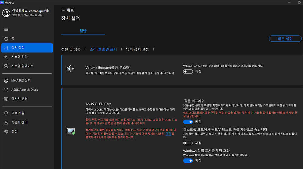 ASUS OLED Care를 활용해서 OLED 화면의 번인 문제도 해결 할 수 있습니다. 한 화면을 최대 밝기에서 너무 오랫동안 고정하면 문제가 되는데 그런 상황에서도 자동으로 픽셀 리프레쉬를 해서 화면에 번인이 생기는것을 막아줍니다.