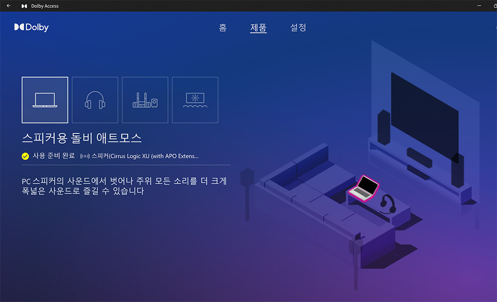 MyASUS에서 업데이트 및 여러가지 설정이 가능한데요. 몇가지만 살펴보겠습니다. 사운드 설정을 통해서 돌비 애트모스 설정이 가능합니다.