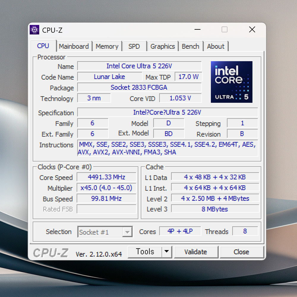 CPU-Z 화면인데요. 인텔® 코어™ Ultra 5 프로세서 226V가 사용되었고, 8코어(4P+4E)로 되어있습니다.