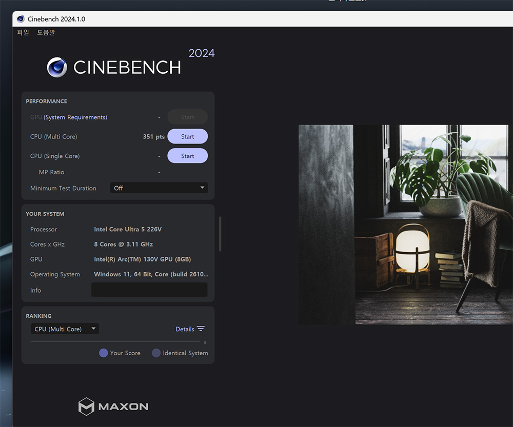 참고로 씨네벤치 2024 CPU 멀티점수는 351 pts 입니다.