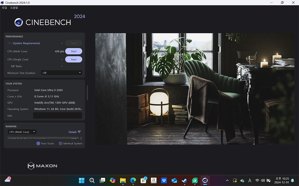 CINEBENCH 2024 멀티점수는 426점 정도 나옵니다.