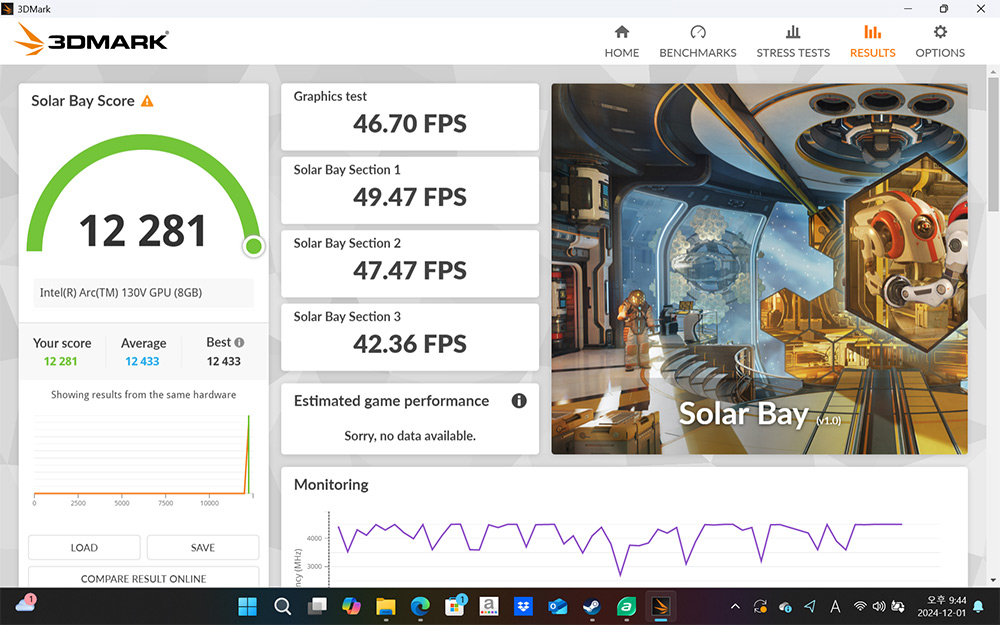 인텔® Arc™ 130V 내장그래픽이 사용되었는데 그래픽점수를 보면 물론 더 고성능 그래픽카드에 비해서는 부족하긴 하지만 내장그래픽의 성능 치고는 우수합니다.